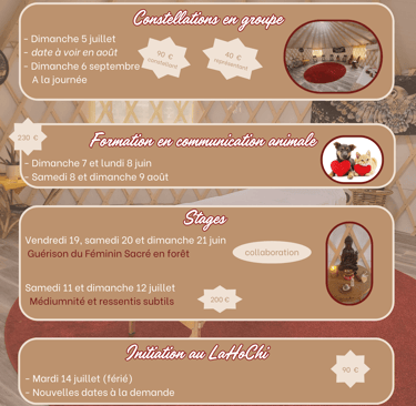 Je vous propose également différents ateliers pour vous épanouir et développer vos potentiels : stages pour développer vos capacités intuitives et médiumniques, de guérison du Féminin sacré, initiation au LaHoChi.